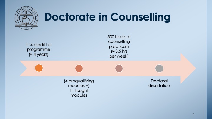 The Doctorate in Counselling is among the first of faith-based programmes in Asia that offer a unique integration of spirituality, theology, psychology, and counselling. Students are pre-qualified senior Christian and community leaders who could demonstrate strong missional focus to bring healing and wholeness to individuals, families, and communities. With an emphasis in practice, the programme equips these leaders in churches, communities and the marketplace with theological and theoretical knowledge, and competencies and proficiencies in counselling.