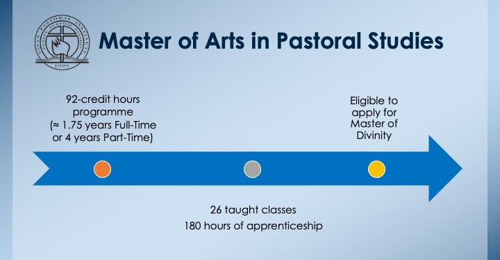 The Master of Arts in Pastoral Studies is a 92-credit programme taught over 1.75 years full time or 4 years part time. Part-time students are allowed up to a maximum 6 years to complete this programme. Students who have completed the Master of Arts in Pastoral Studies are eligible to apply for admission to the Master of Divinity (Pastoral Studies).