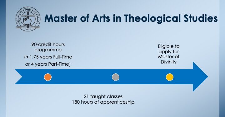 The Master of Arts in Theological Studies is a 90-credit programme. Students would be awarded a Master of Arts in Theological Studies if they