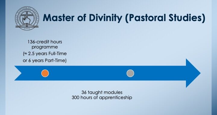 The Master of Divinity (Pastoral Studies) is a 136-credit programme taught over 2.5 years full time or 6 years part time. Part-time students are allowed up to a maximum 10 years to complete this programme.